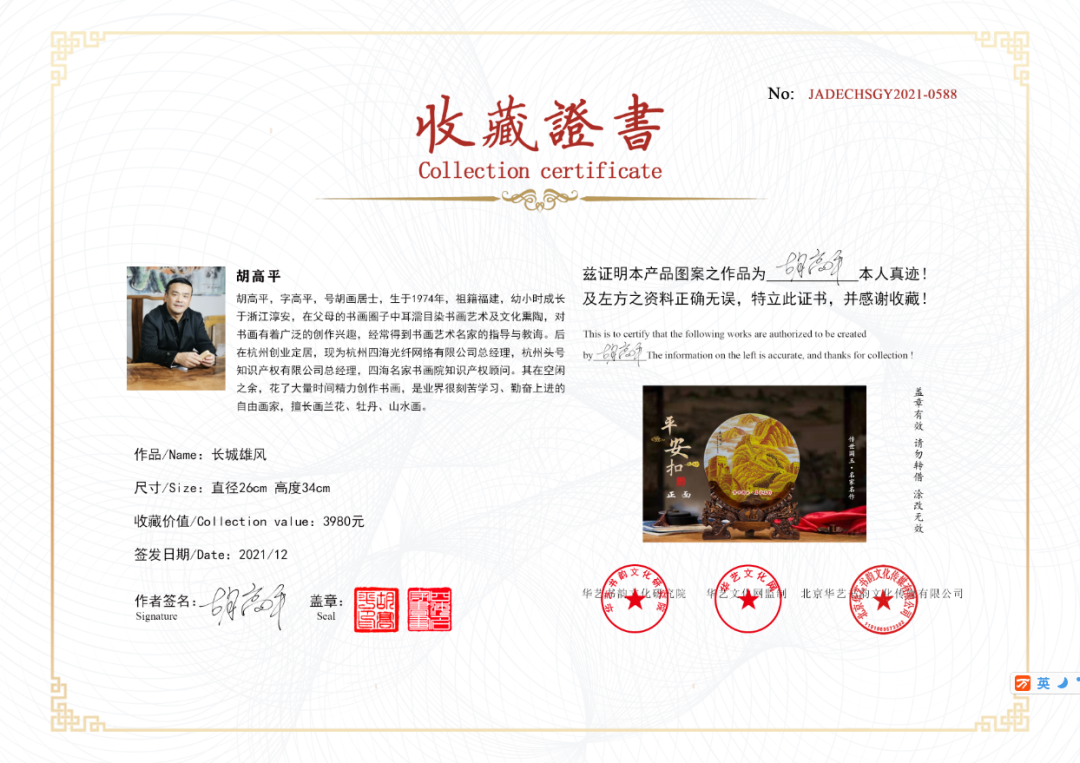 收藏级玉石赏盘面艺术品艺术家出具的收收藏证书